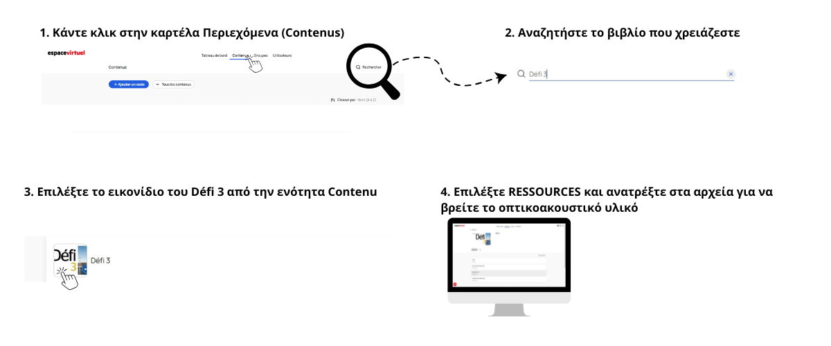 Τα ακουστικά αρχεία και τα video για όλα τα προϊόντα του Défi 3 Livre de l’élève.